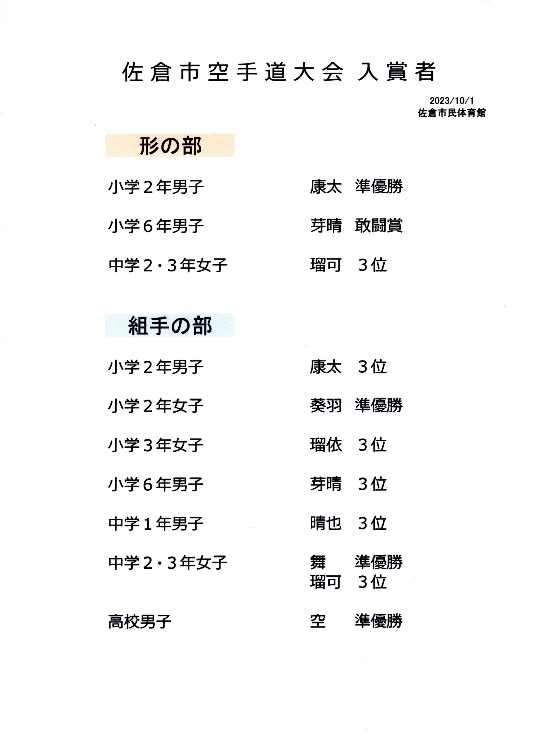 佐倉市空手道大会入賞者